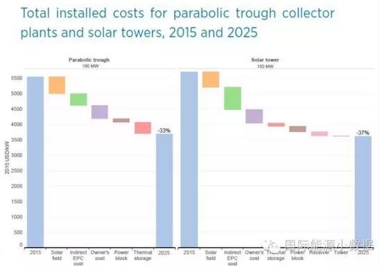 光伏成本持续下降,那么光热发电成本如何变化呢?以7.5-9小时储能容量为例,160兆瓦槽式光热电站装机成本可望下降33%,从5.5美元/瓦下降到3.6美元/瓦;而150兆瓦塔式光热电站成本可望下降37%,从大约5.7美元/瓦降至3.6美元/瓦。
