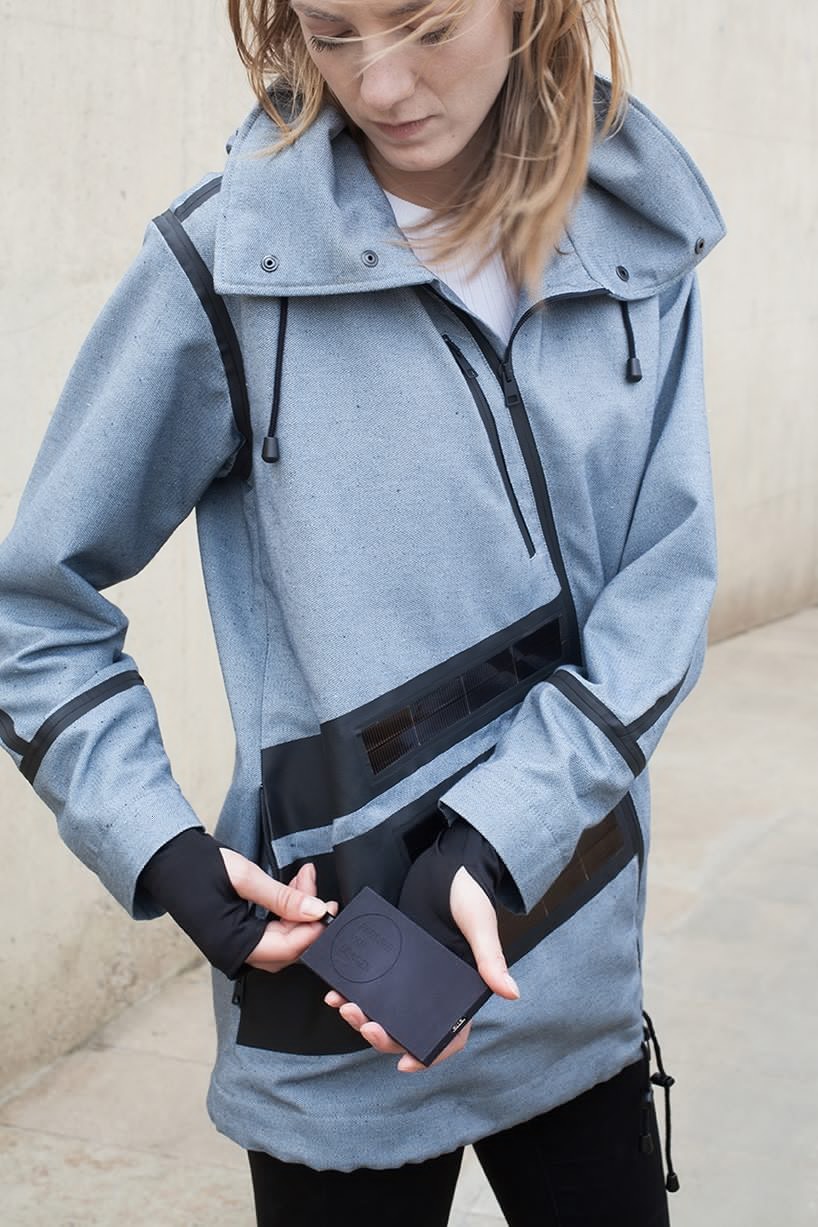 夹克上的太阳能电池板被设计成显眼的三斜条,通过压层法嵌于衣服中,感应式充电系统可以为智能手机无线充电1-2个小时,其它设备借助USB线也可以充电。在风衣的内衬中,还有一个移动电源,天气不好电力不够的时候可以派上用场。
