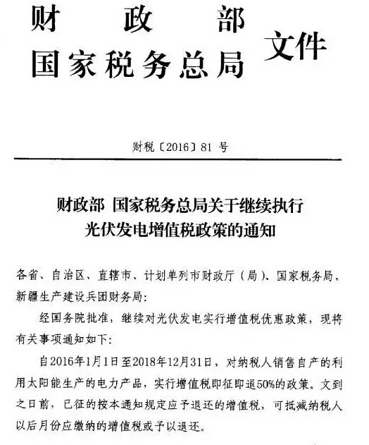 昨日深圳市某地税局官方微信爆料称,国家财政部、国家税务总局下达了《关于继续执行光伏发电增值税政策的通知》,通知中称“经国务院批准,继续对光伏发电实行增值税优惠政策”、“自2016年1月1日至2018年12月31日,对纳税人销售自产的利用太阳能生产的电力产品,实行增值税即征即退50%的政策。文到之日前,已征的按本通知规定应予退还的增值税,可抵减纳税人以后月份应缴纳的增值税或予以退还。”