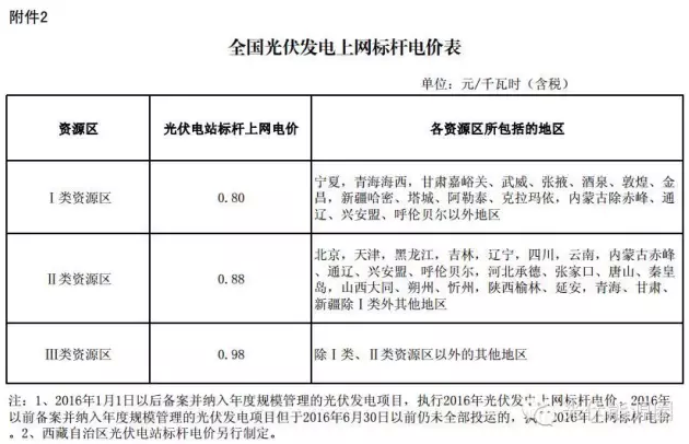 ②如果选择全额上网模式,则所发的电全部按照当地光伏发电标杆上网电价来收购。不同地区电价标准不一样,具体如下表: