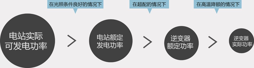 逆变器的超配。光伏发电系统由于组件功率的逐年衰减、灰尘遮挡以及线路老化的发生,再加上不同地区的日照条件的不同,为了获得最佳收益,在实际操作中把光伏组件的总功率配得比逆变器总功率大一些,这种就叫做超配。适当的超配可以降低电站的初始投资,提高综合收益。正是如此,超配才被广泛应用。在通常的电站设计中,电站年平均满发小时数为1500h左右,光伏组件和逆变器一般情况最佳的设计比为1.1~1.2:1。