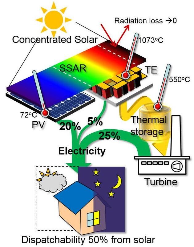 通过技术混搭,普渡大学的研究者们创造了一个全新的概念,它混合了现有三种太阳能技术,分别是PV、热电技术(TE)和聚光太阳能技术。当然,该系统并不是简单地将三种技术累加在一起,而是充分利用太阳光谱,构建了一个完整有序的系统。