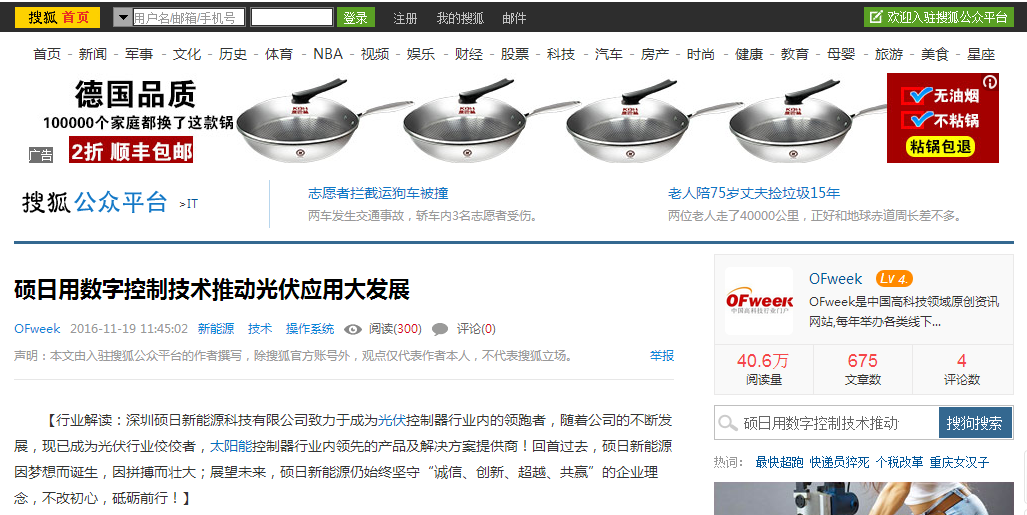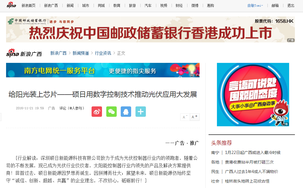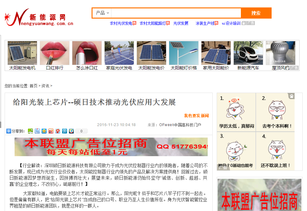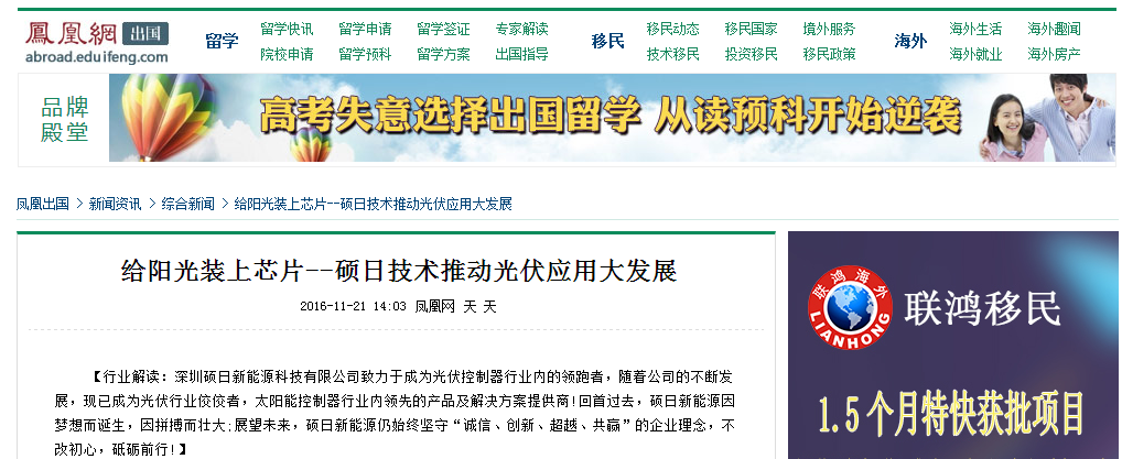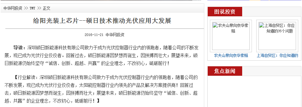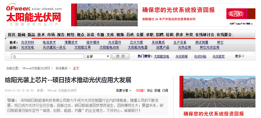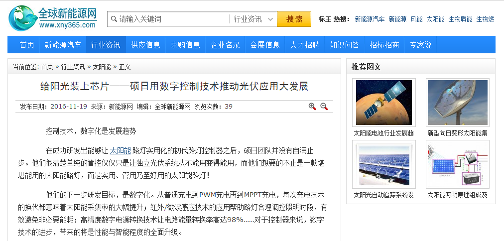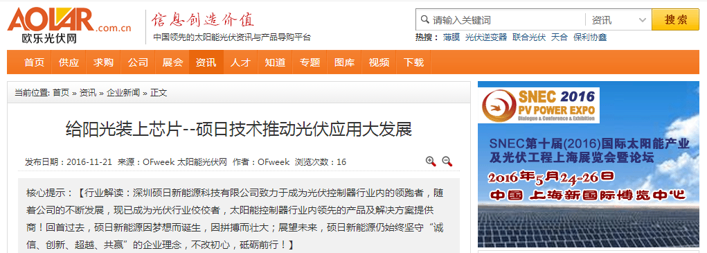2016年11月18日,万众瞩目,光伏控制技术创新论坛暨硕日新品发布会在扬州成功召开后,引起了各大媒体和行业的震撼关注!作为光伏储能管控专家的硕日,是全国以光伏控制器技术创新为核心的企业,8年来只专注做一件事,把太阳能控制器做到极致,“给阳光装上芯片”,硕日技术推动了光伏应用大发展,引无数媒体争相报道,在行业内和网上掀起关于“硕日”的信息狂潮。