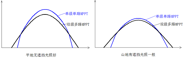 在山地或者屋顶有遮挡光照条件一般的地区,双级多路MPPT的逆变器发电量高。这是因为在低电功率发电时间段时间较长,高功率发电时间较短。