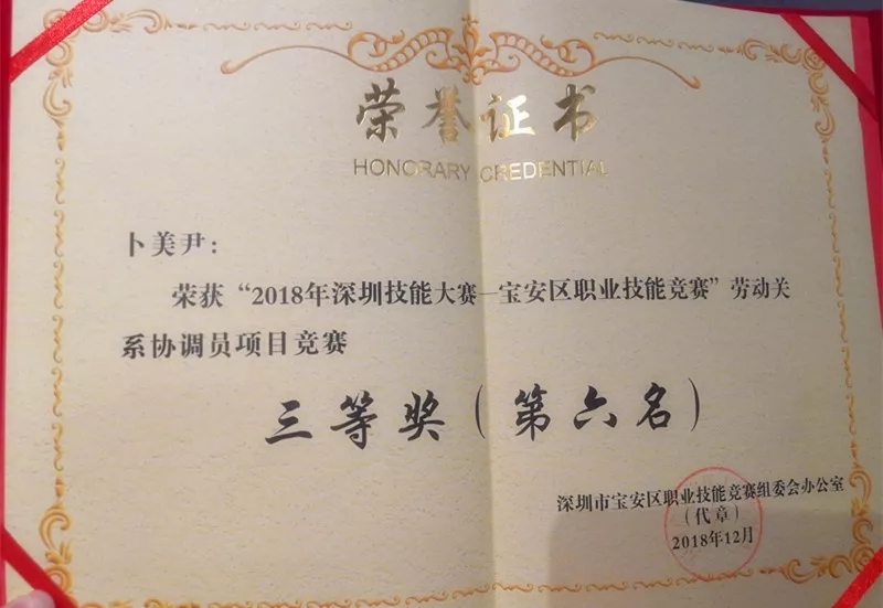 卜美尹女士作为硕日资深HR经理,在工作中尽职尽责,起到模范带头作用,具有一定影响力。本次代表硕日参与宝安区技能竞赛劳动关系协调师项目中,荣获三等奖。