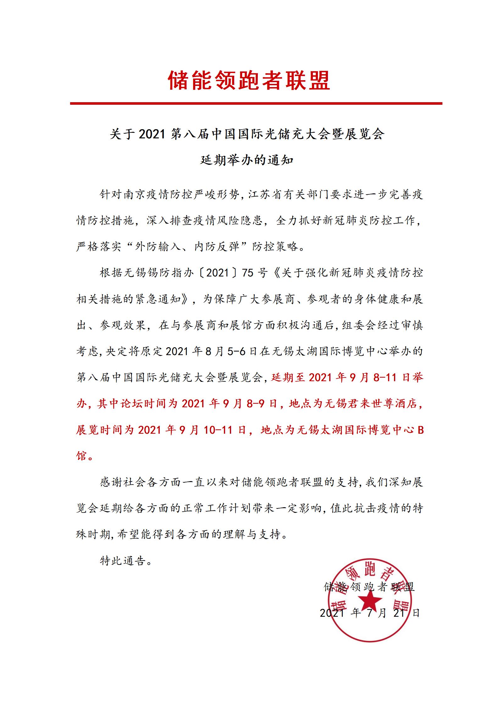 通知 | 关于第八届中国国际光储充大会暨展览会延期通知