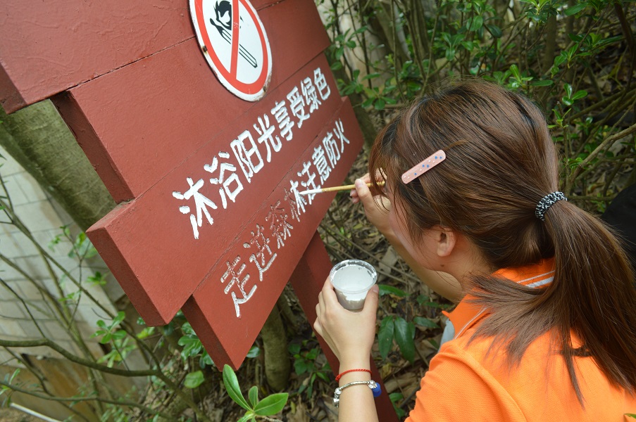 此处必须有掌声!完成比赛的这位同事帮助森林防护同志为宣传板涂油漆,满满都是爱啊~大写的“赞”字!
